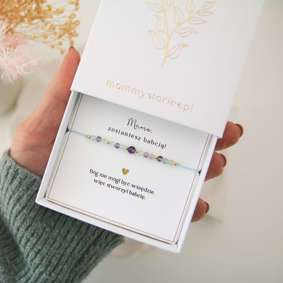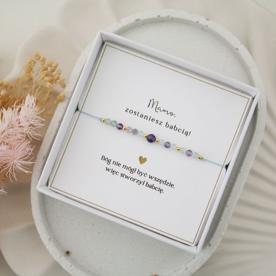 Bransoletka na sznureczku to świetny pomysł na prezent dla Babci! Możesz wybrać gotową dedykację "Jesteś wspaniałą babcią" lub "Mamo, zostaniesz babcią" lub stworzyć własny tekst - umieścimy go na karteczce wewnątrz pudełeczka.