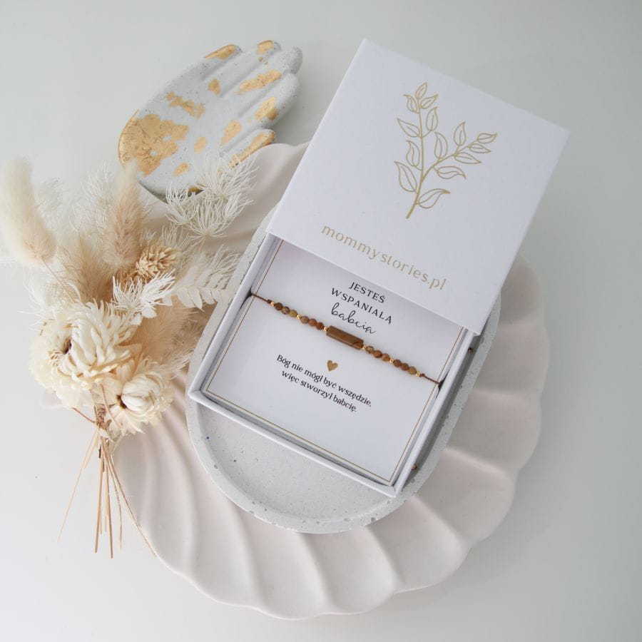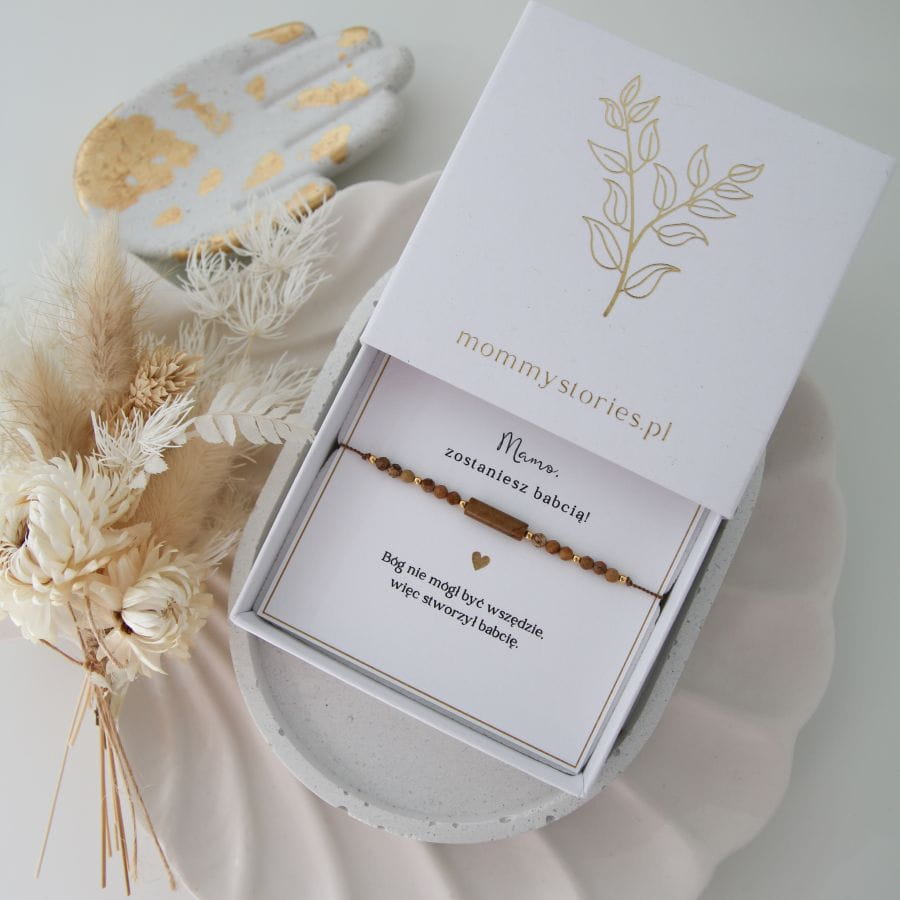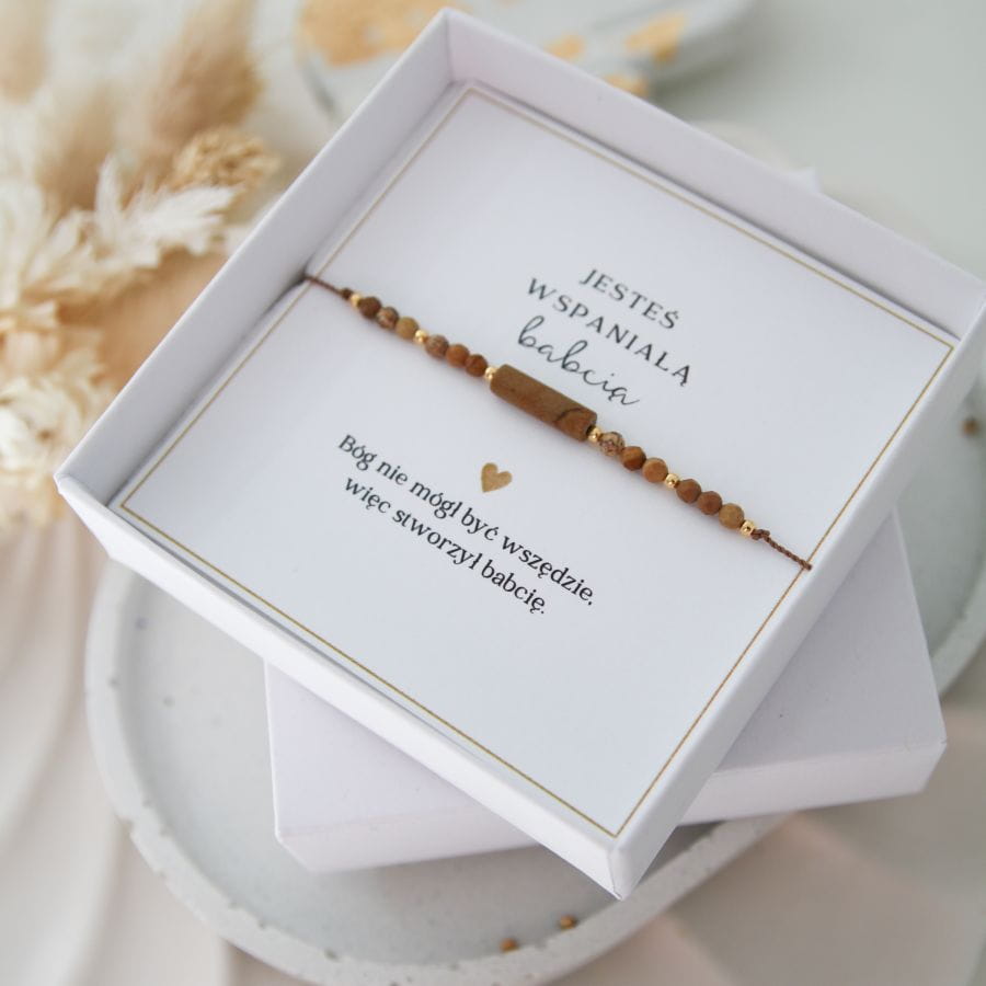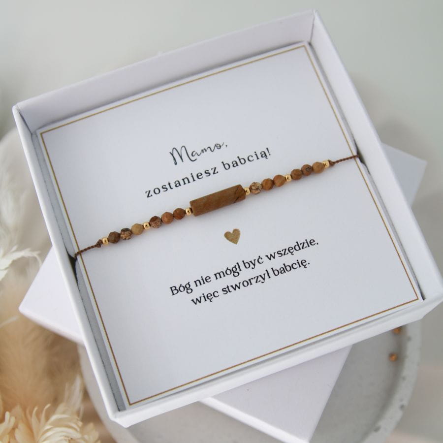 Bransoletka na sznureczku to świetny pomysł na prezent dla Babci! Możesz wybrać gotową dedykację "Jesteś wspaniałą babcią" lub "Mamo, zostaniesz babcią" lub stworzyć własny tekst - umieścimy go na karteczce wewnątrz pudełeczka.