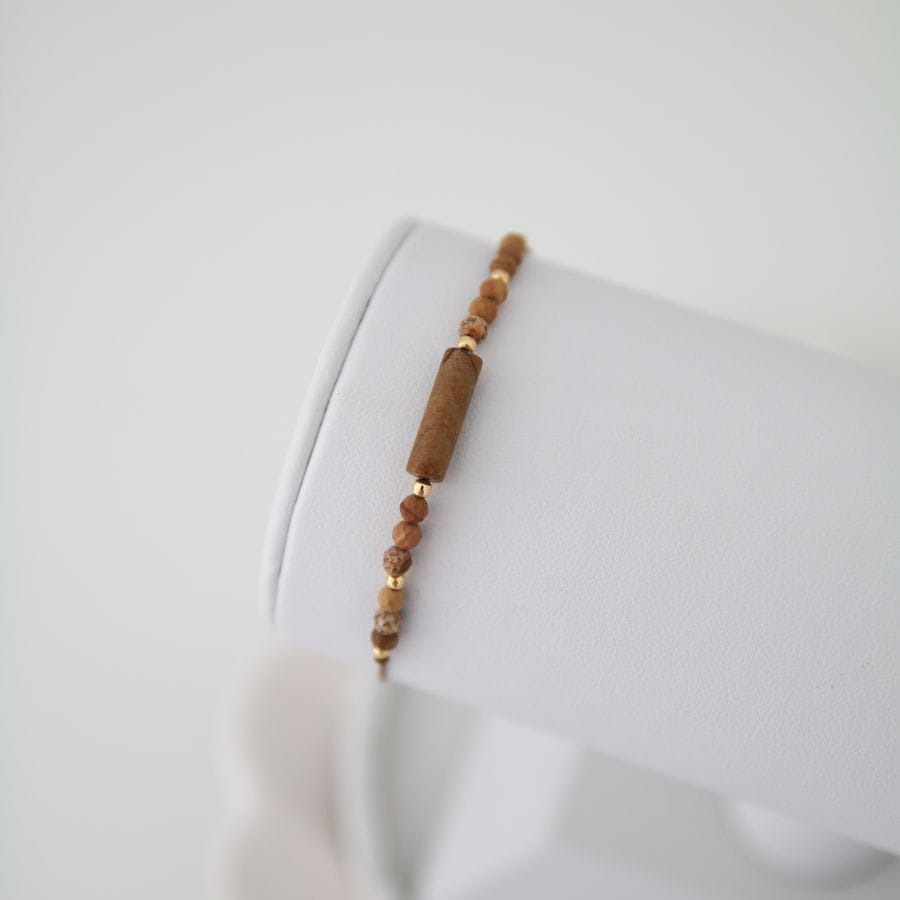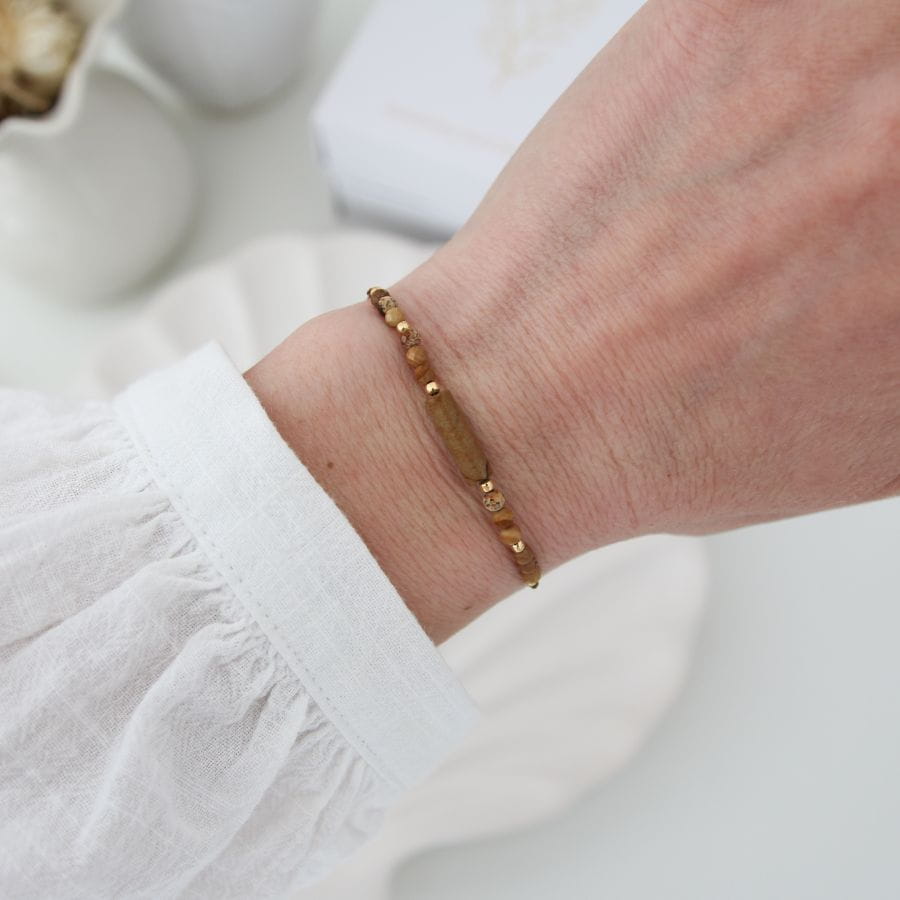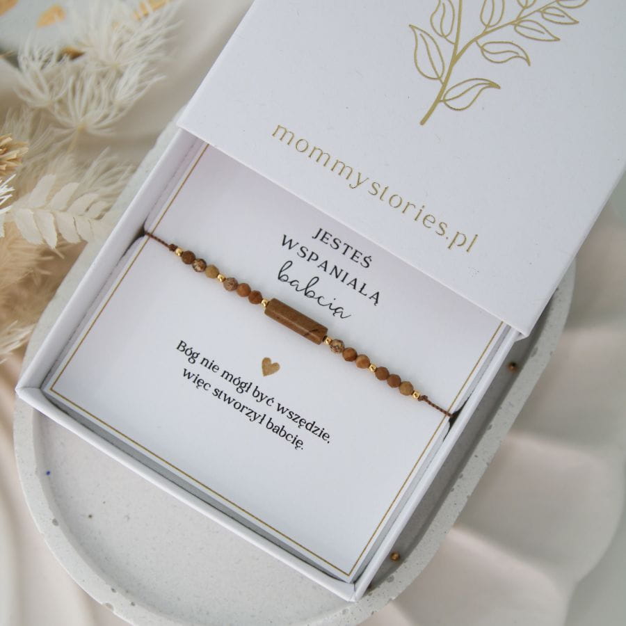 Beżowo-brązowe kamienie Jaspisu Obrazkowego pięknie prezentują się na nadgarstku. Dopełnieniem są kuleczki ze złotego hematytu, przewleczone brązową nicią. Całość wygląda wdzięcznie i elegancko - sprawdzi się dla babć lubiące modowe nowości jak i klasyczne dodatki. Bransoletka pasuje na każdy nadgarstek, ma regulowany rozmiar. Zakończona jest stoperem, który zapewnia wygodną regulację oraz ułatwia zdjęcie i założenie bransoletki na rękę.