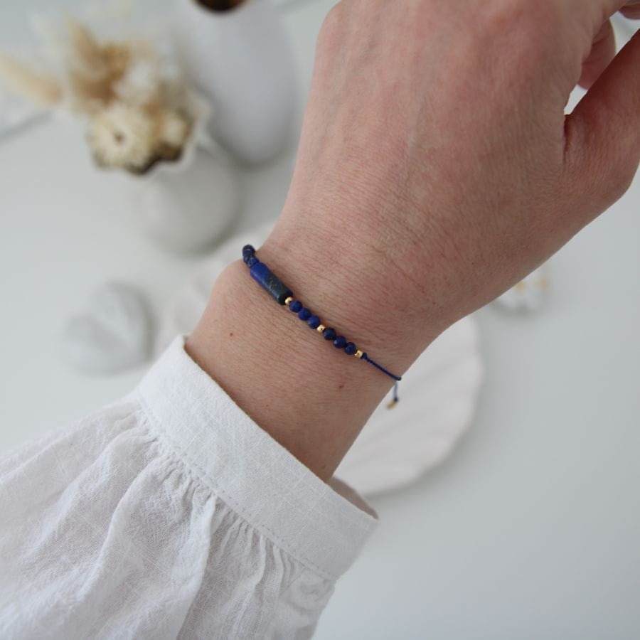 Granatowe kamienie Lapis Lazuli pięknie prezentują się na nadgarstku. Dopełnieniem są drobne kuleczki ze złotego hematytu, przewleczone granatową nicią. Całość wygląda wdzięcznie i elegancko - sprawdzi się dla babć lubiące modowe nowości jak i klasyczne dodatki. Nie musisz martwić się rozmiarem! Bransoletka pasuje na każdy nadgarstek - ma regulowany rozmiar. Zakończona jest stoperem, który zapewnia wygodną regulację oraz ułatwia zdjęcie i założenie bransoletki na rękę.