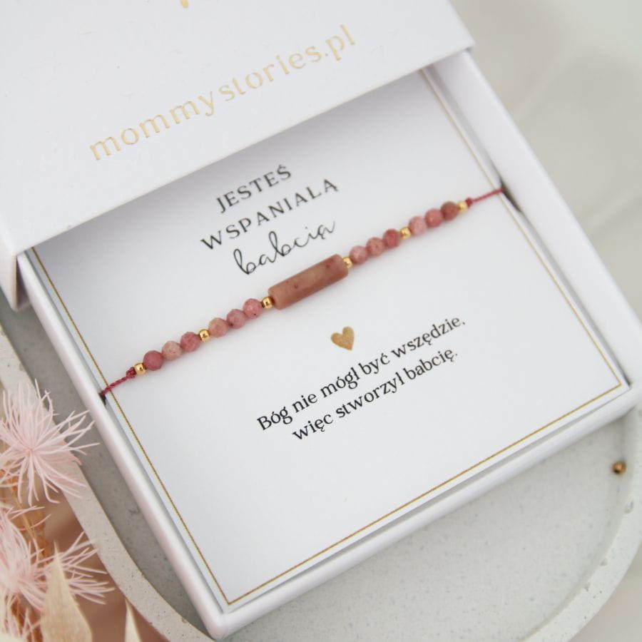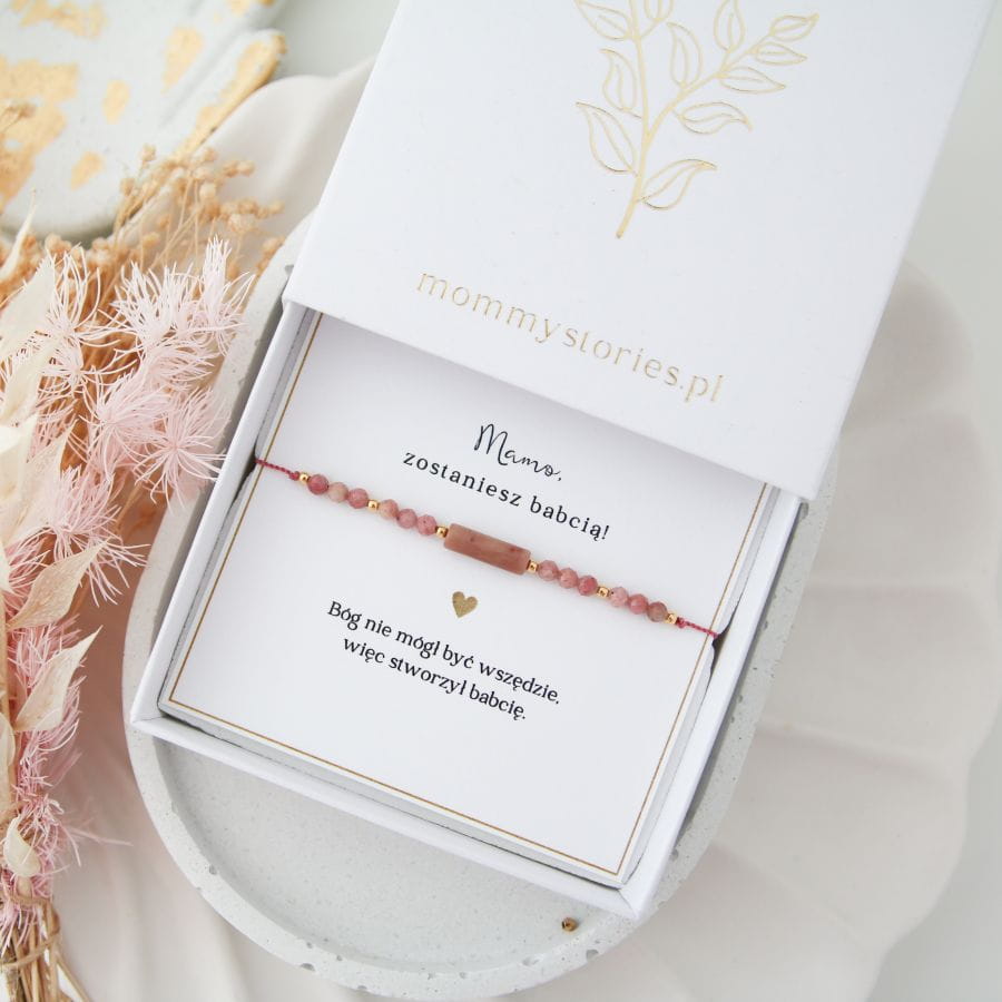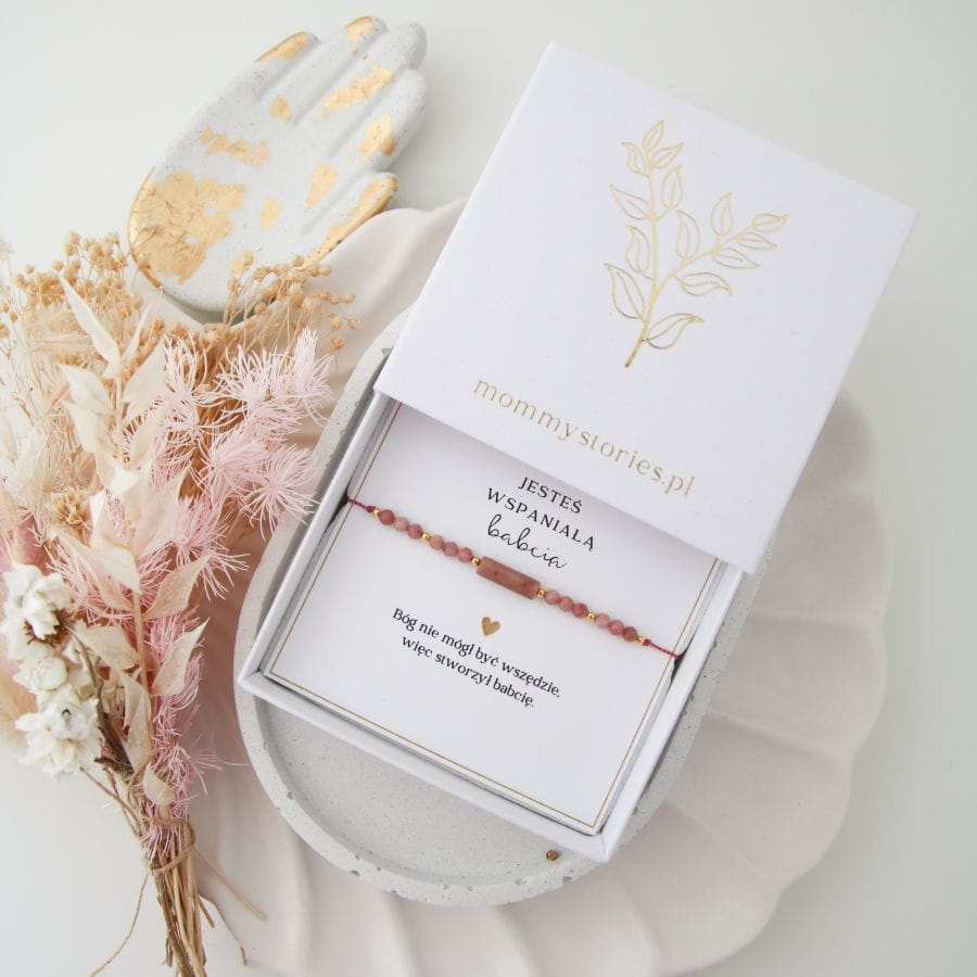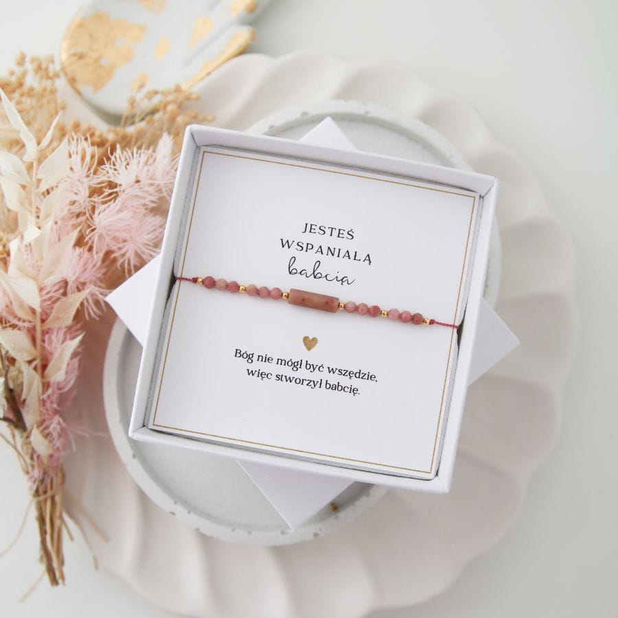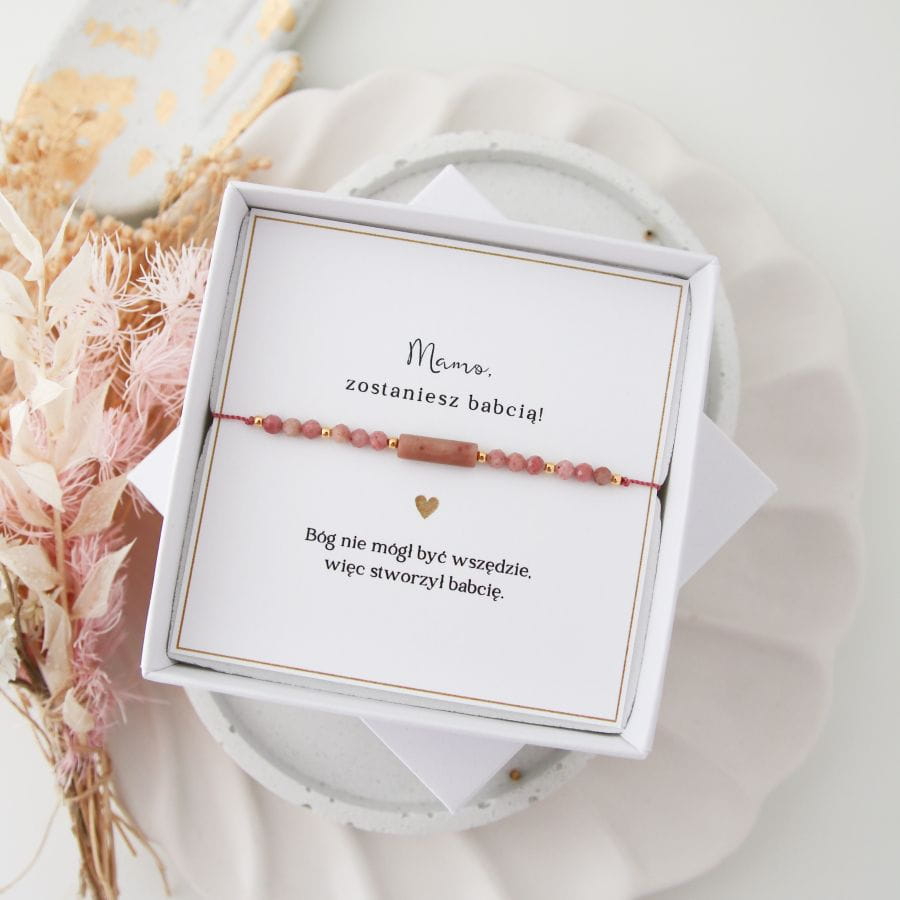 Bransoletka na sznureczku to świetny pomysł na prezent dla Babci! Możesz wybrać gotową dedykację "Jesteś wspaniałą babcią" lub "Mamo, zostaniesz babcią" lub stworzyć własny tekst - umieścimy go na karteczce wewnątrz pudełeczka.