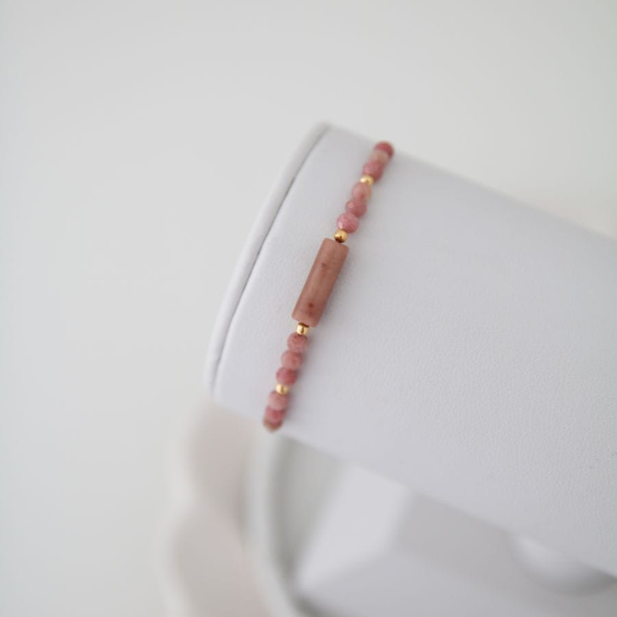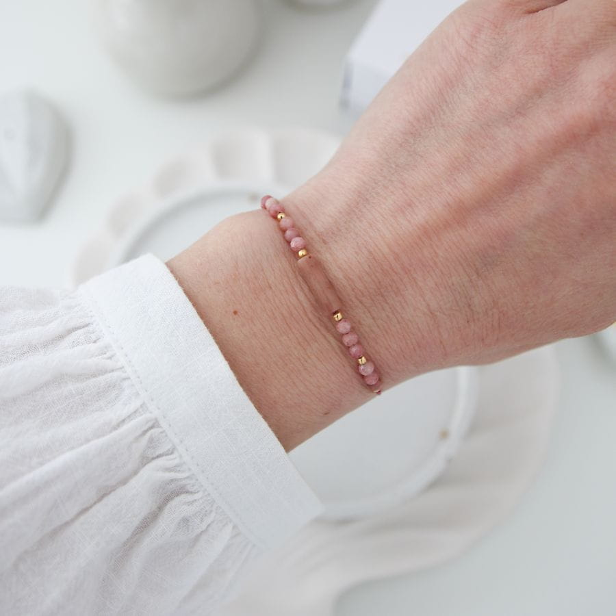 Różowe kamienie Rodonitu pięknie prezentują się na nadgarstku. Dopełnieniem są złote kuleczki z hematytu, przewleczone różową nicią. Całość wygląda wdzięcznie i elegancko - sprawdzi się dla babć lubiące modowe nowości jak i klasyczne dodatki. Nie musisz znać rozmiaru - bransoletka pasuje na każdy nadgarstek, ponieważ ma regulację rozmiar.