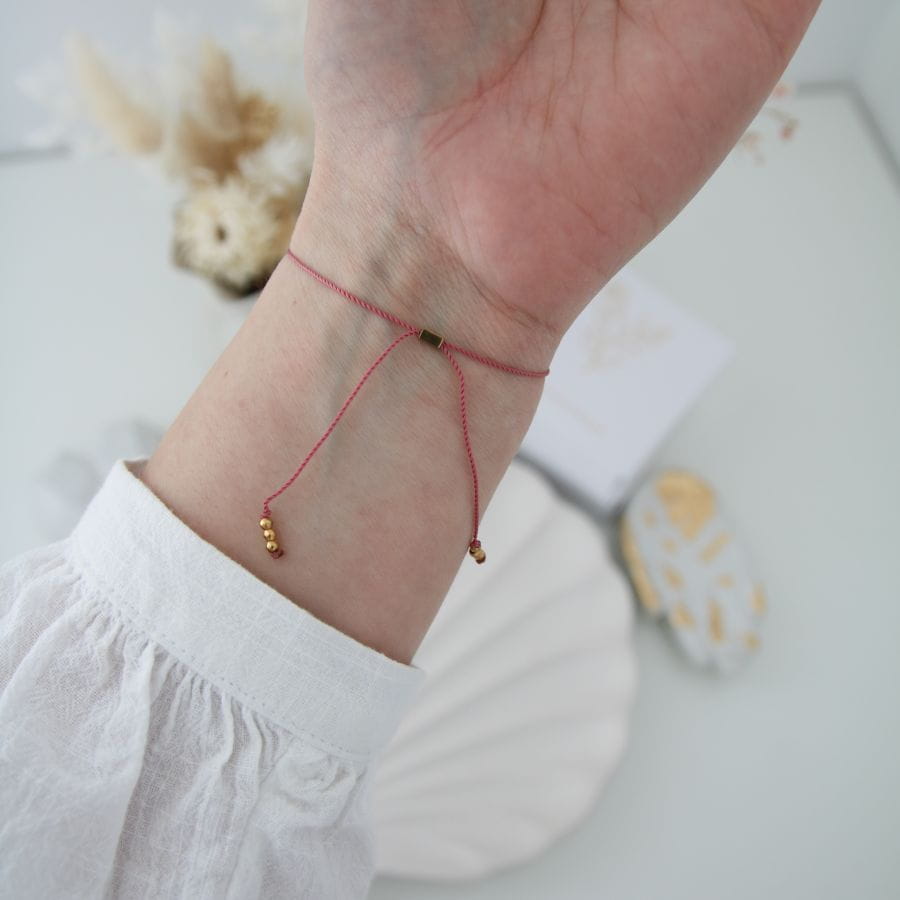 Zakończona jest stoperem, którym można dopasować długość nici do nadgarstka. Stoper ułatwia zdjęcie i założenie bransoletki na rękę.