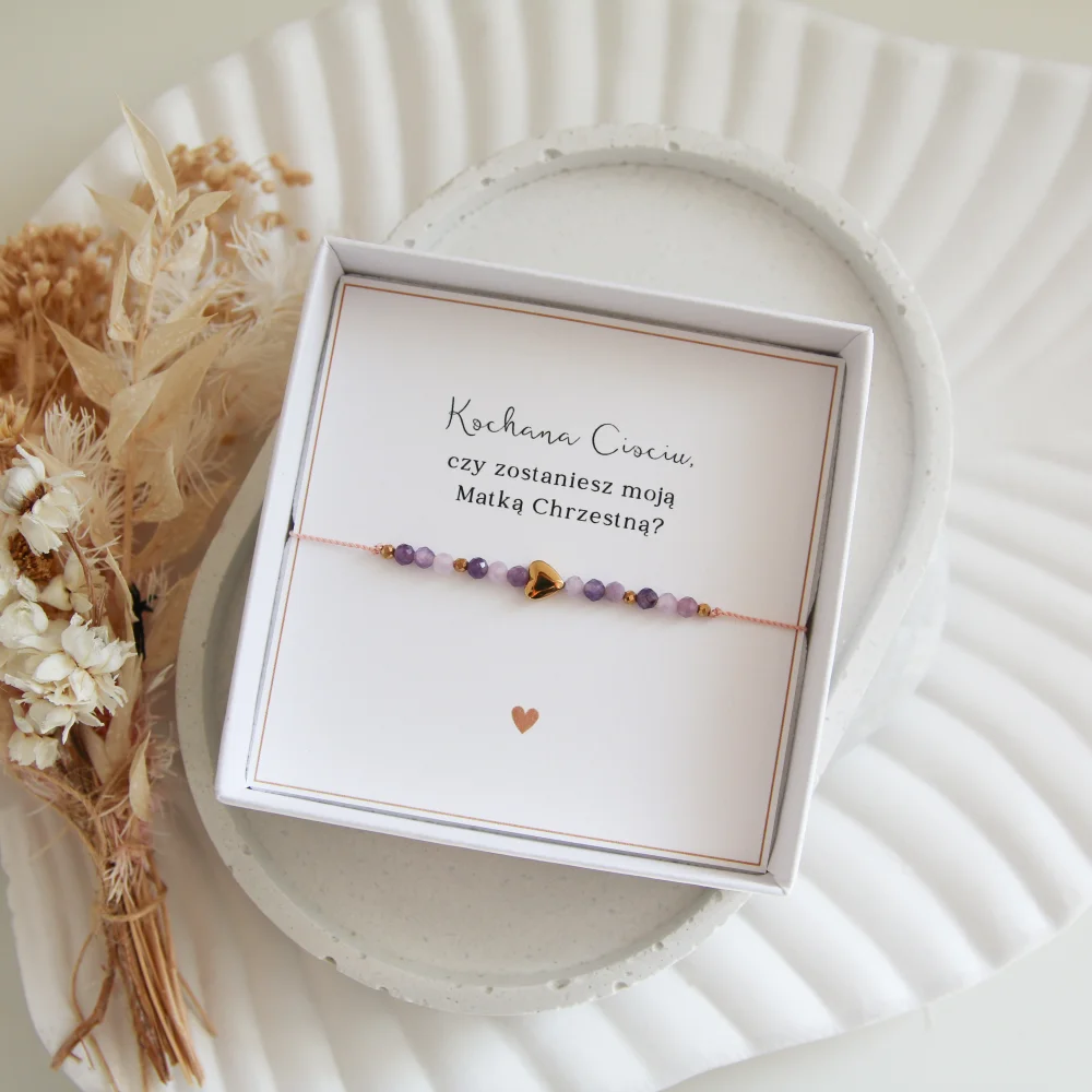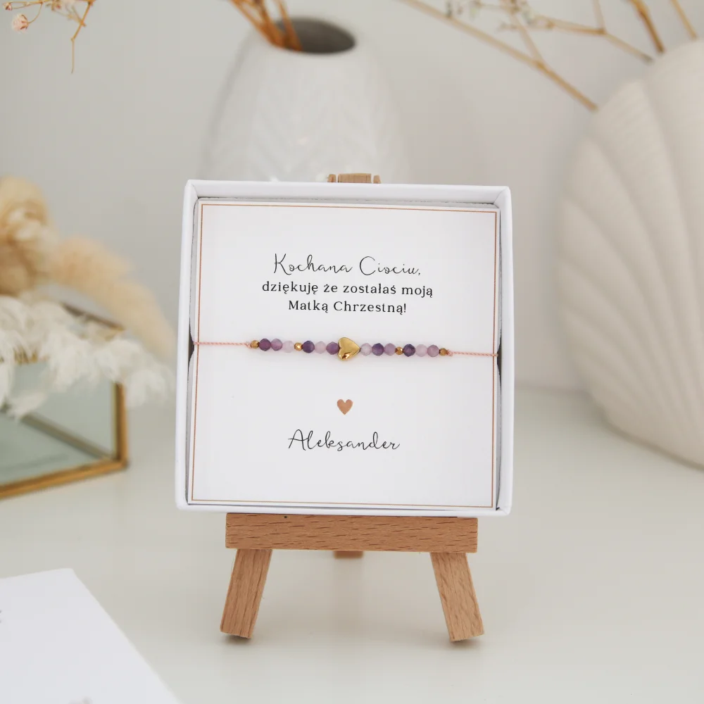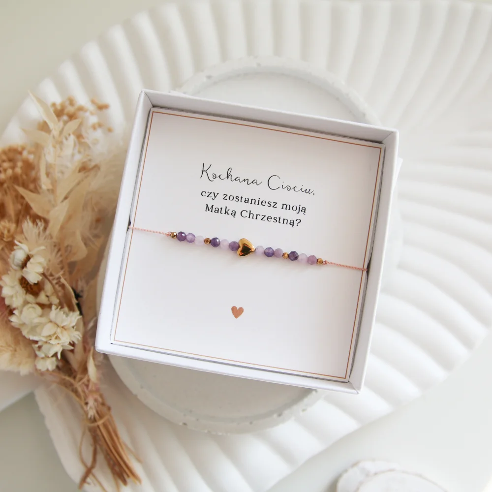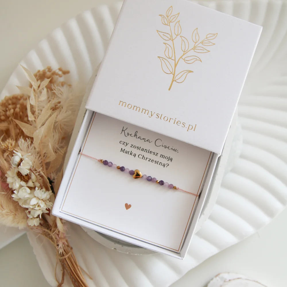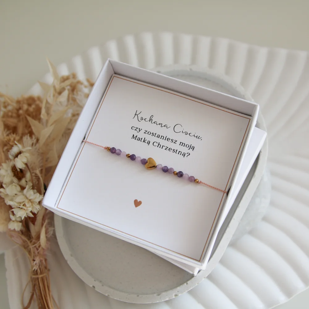 Całość osadzona jest na eleganckiej nici w cielistym kolorze, dzięki czemu bransoletka jest ponadczasowa i pasuje do każdej stylizacji. Regulowany rozmiar pozwala idealnie dopasować ją do nadgarstka. To piękny i wzruszający prezent dla chrzestnej – pełen serca, wdzięczności i dobrych emocji