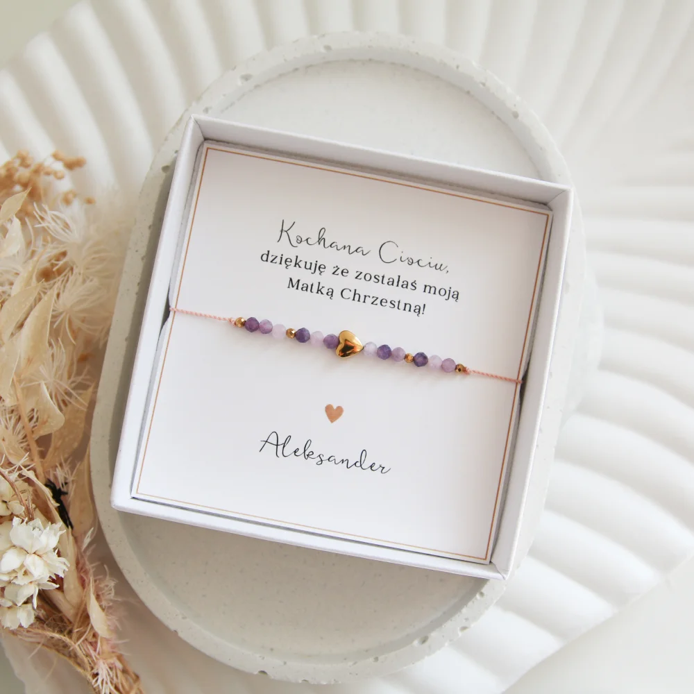 Wyjątkowa bransoletka stworzona jako symbol wdzięczności i piękny gest dla chrzestnej. To delikatny, pełen znaczenia prezent, który podkreśla bliskość i wyjątkową więź. Bransoletka wykonana jest z naturalnego lepidolitu oraz serduszka z hematytu – połączenia, które symbolizuje harmonię, wewnętrzny spokój i siłę. To subtelny talizman, który może towarzyszyć każdego dnia jako przypomnienie o tym, co naprawdę ważne.