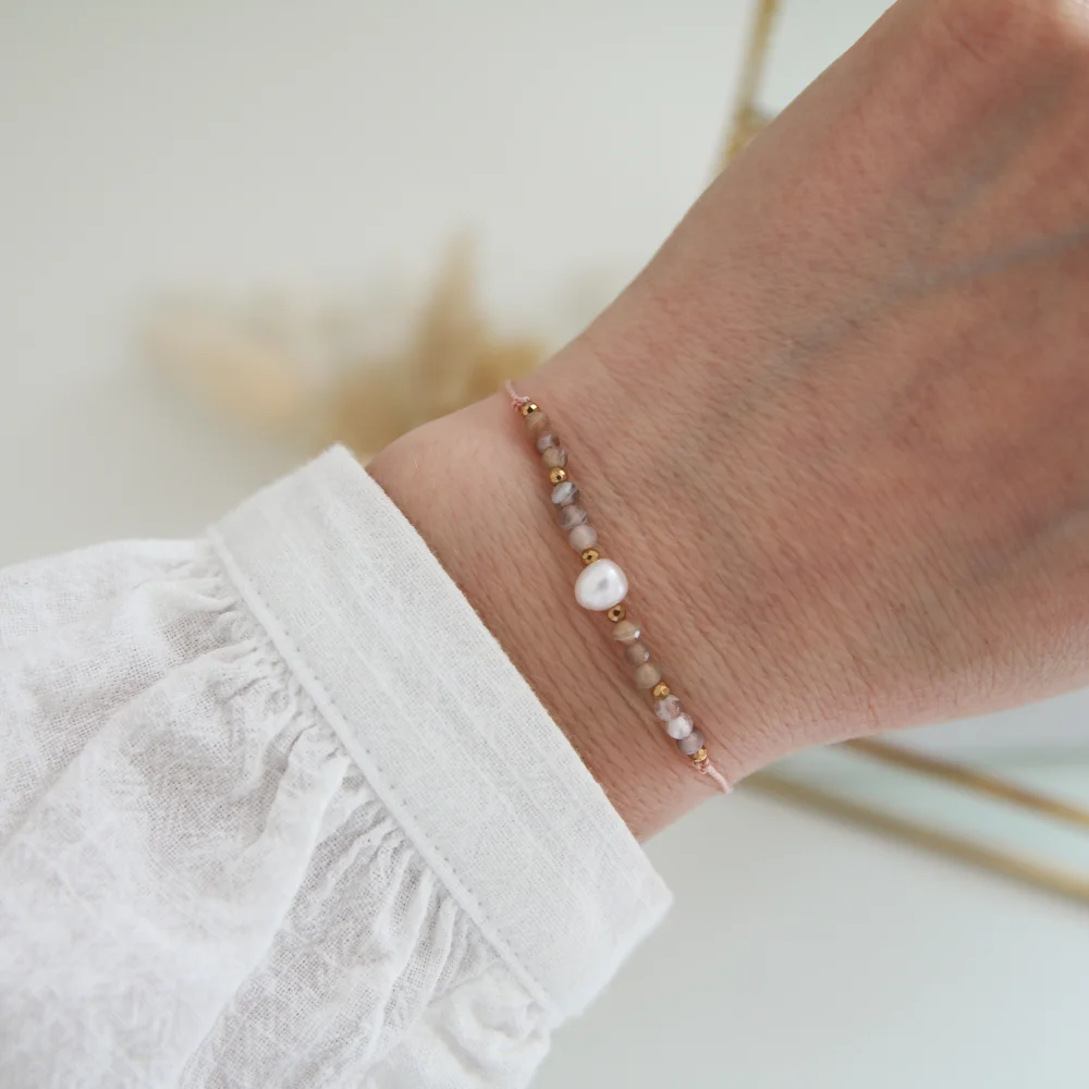 Szlachetne kamienie Agatu Botswana oraz mała Perełka pięknie prezentują się na nadgarstku. Dopełnieniem są hematytowe kuleczki w złotym kolorze przewleczone elegancką, jasnoróżową nicią. Całość tworzy modny dodatek do codziennej i okazyjnej stylizacji. Nie musisz martwić się rozmiarem, gdyż jest uniwersalny. Bransoletka zakończona jest stoperem, który zapewnia wygodną regulację rozmiaru oraz ułatwia zdjęcie i założenie bransoletki na rękę.