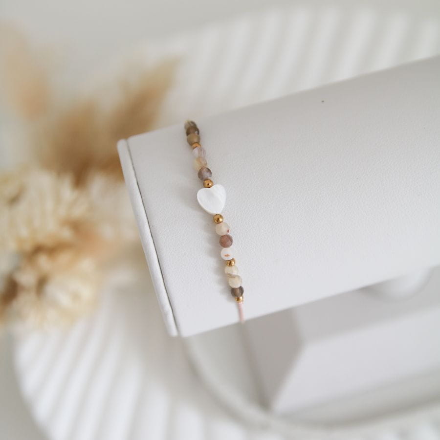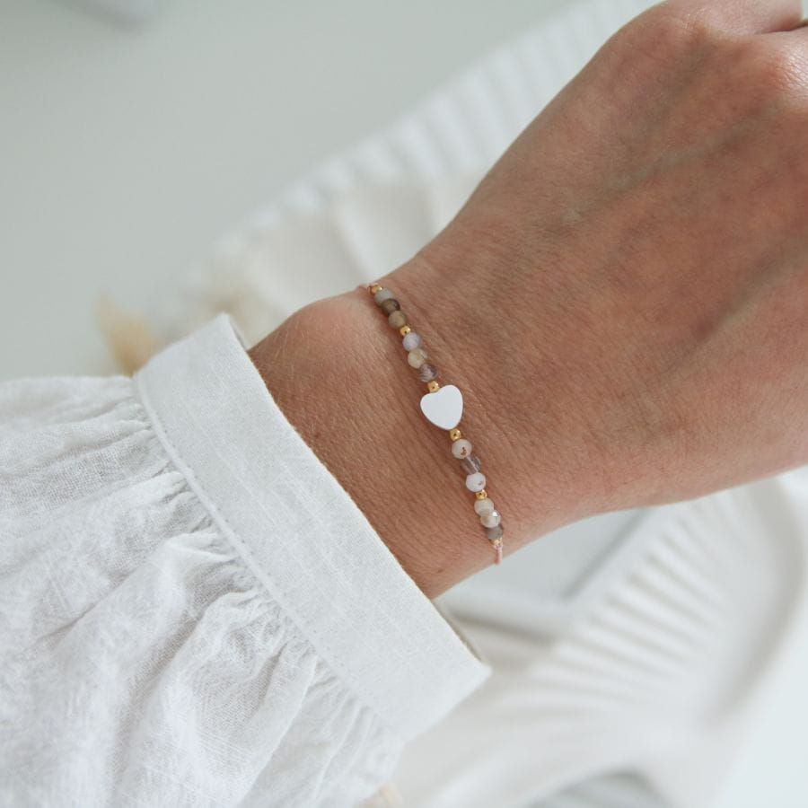Agat symbolizuje spokój i równowagę – wartości tak ważne w okresie oczekiwania na dziecko. Uzupełnia go subtelne serduszko z masy perłowej, będące symbolem miłości, oraz złociste kuleczki hematytu, które dodają całości elegancji.