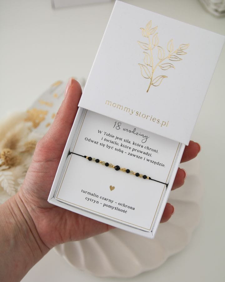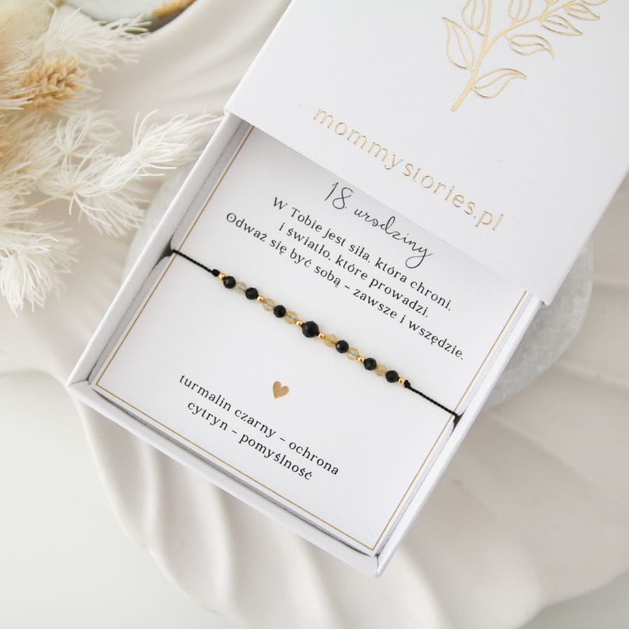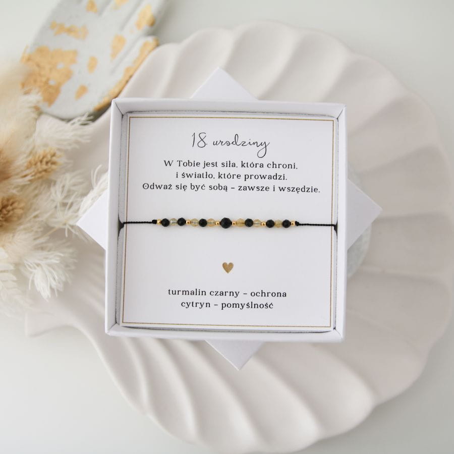 Bransoletka z turmalinem i cytrynem przypomina, że dorosłość to nie tylko odpowiedzialność, ale też szansa, by tworzyć własne życie z odwagą i radością. Czarny turmalin daje poczucie bezpieczeństwa i stabilności, a cytryn wnosi światło, entuzjazm i wiarę w dobry los. To symbol równowagi między mądrością a spontanicznością – idealny na nowy początek.