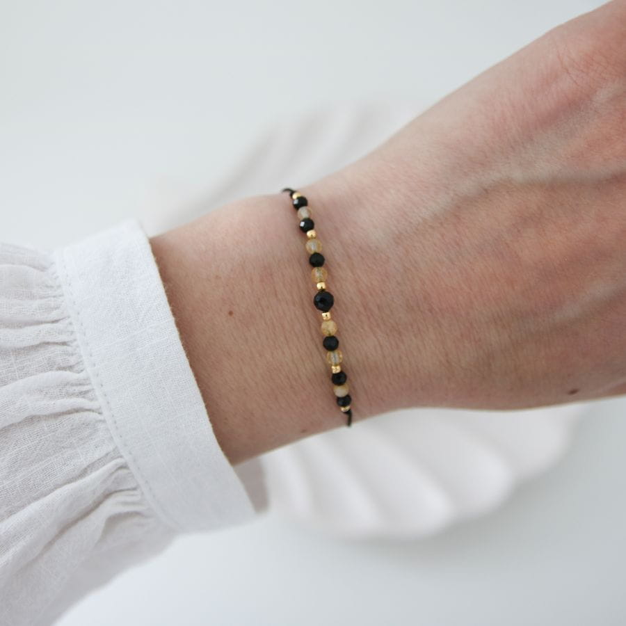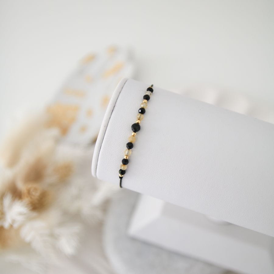 Bransoletka składa się z czarnego turmalinu, cytrynu oraz drobnych, złotych kuleczek z hematytu. Kamienie nawleczone są na czarną nić - całość pięknie prezentuje się na nadgarstku. Nie musisz martwić się rozmiarem, gdyż jest uniwersalny. Bransoletka zakończona jest stoperem, który zapewnia wygodną regulację rozmiaru oraz ułatwia zdjęcie i założenie bransoletki na rękę.