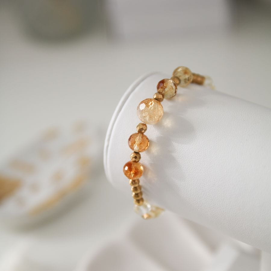 Bransoletka składa się ze szlachetnych kamieni Cytrynu oraz złotego hematytu. Wielkość kamieni to 10mm,8mm,6mm. Koraliki nawleczone są na elastyczną żyłkę jubilerską, dostępne w dwóch rozmiarach do wyboru: