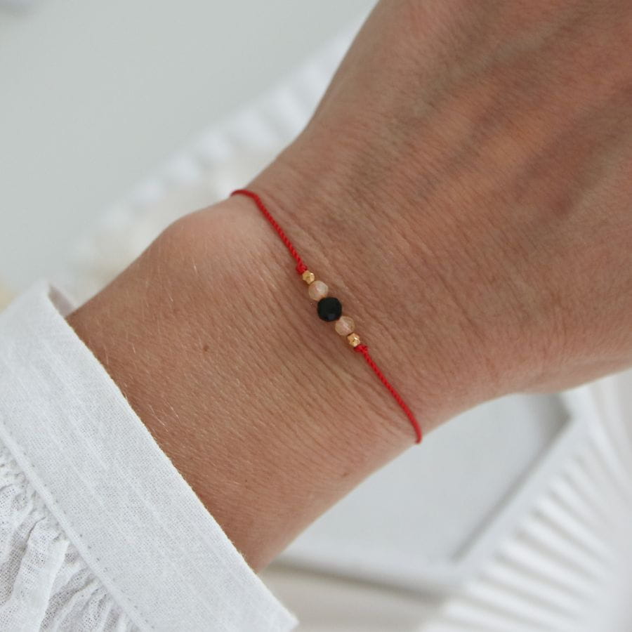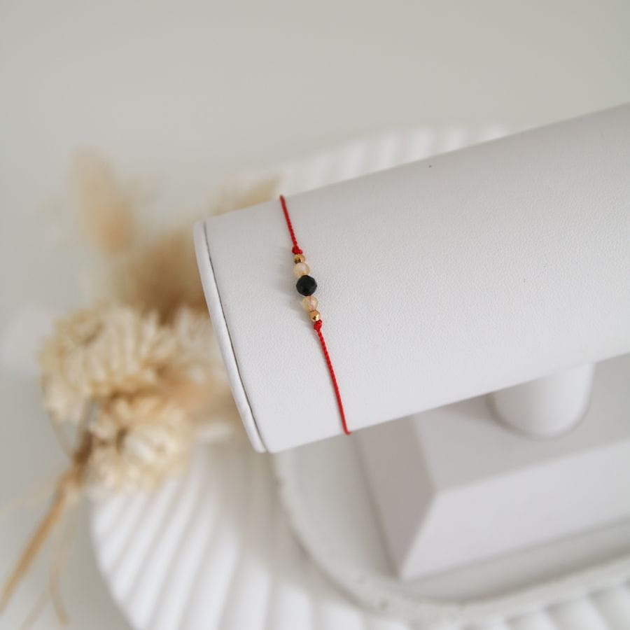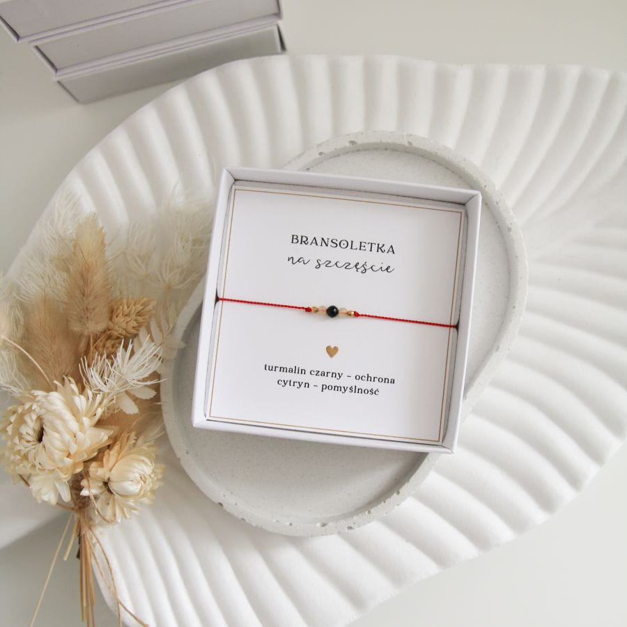 Bransoletka na szczęście na czerwonej nici, z Cytrynem i Turmalinem Czarnym. Minimalistyczna, stylowa, idealna na prezent dla siebie lub bliskiej osoby.