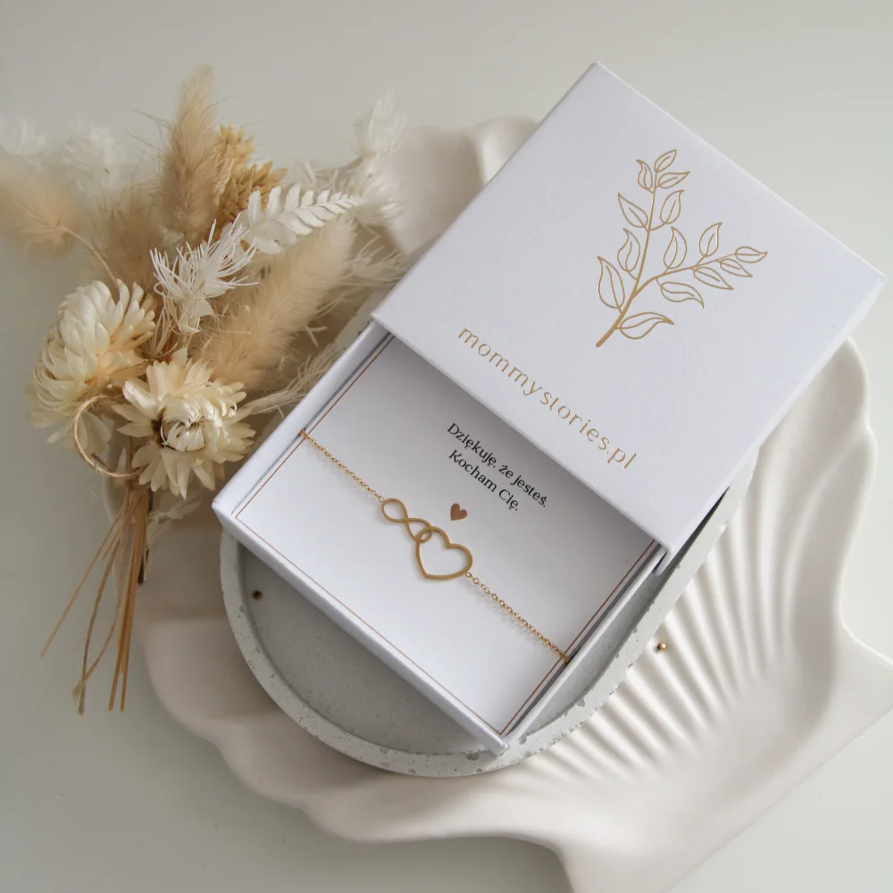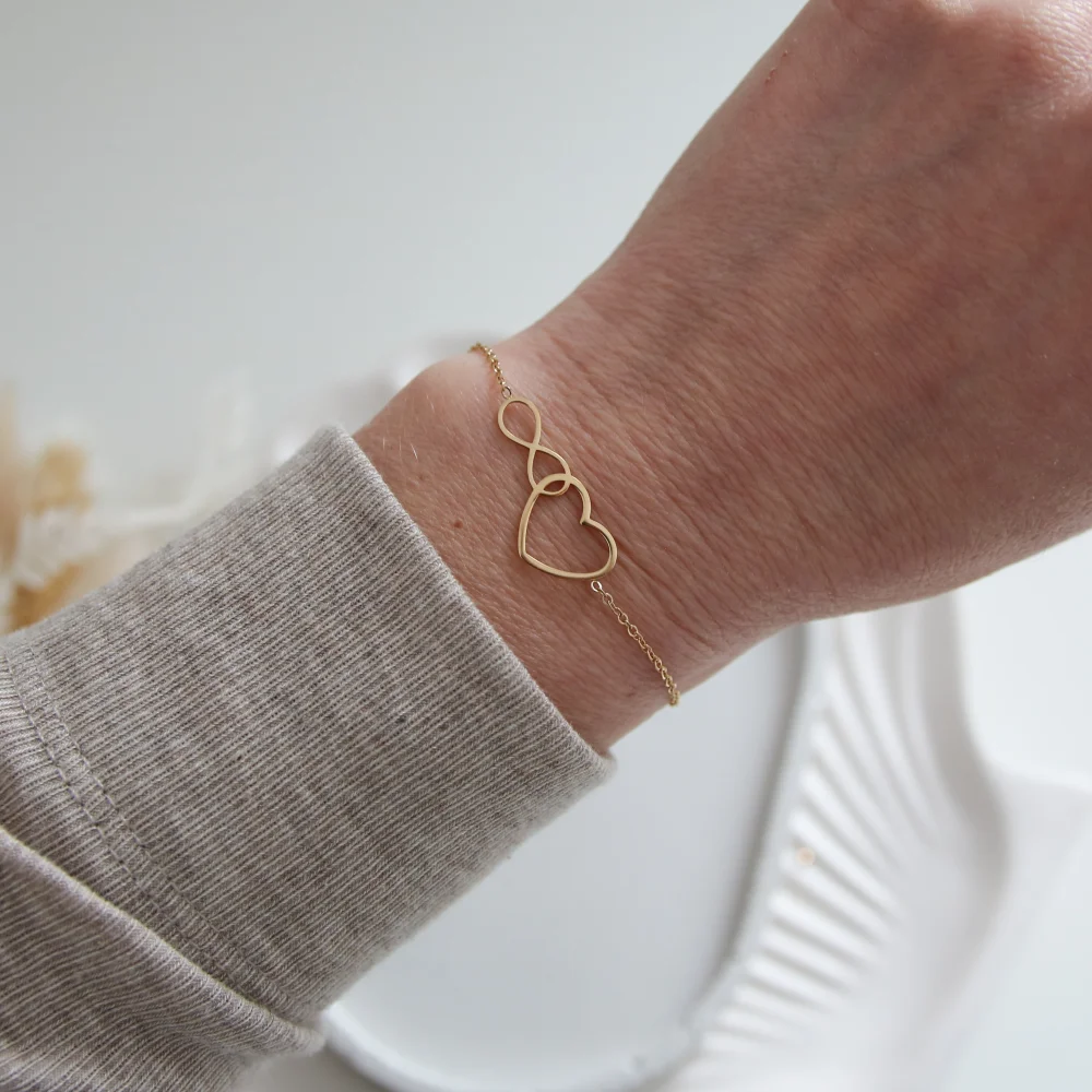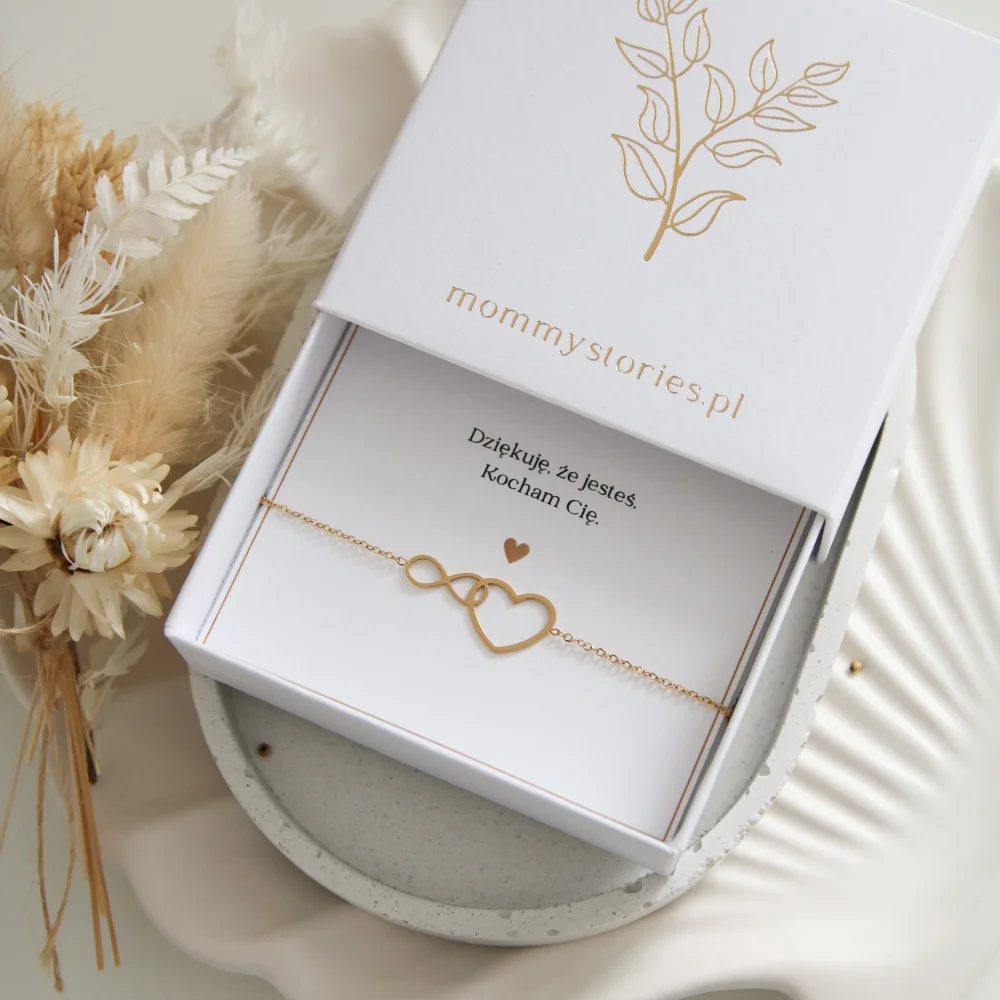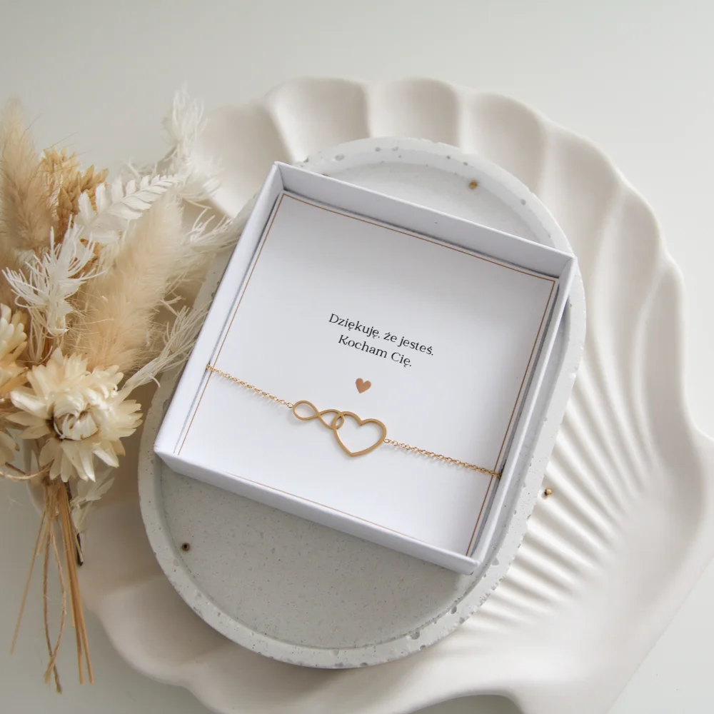 Bransoletka na łańcuszku, z motywem serca i nieskończoności – symbolem trwałej więzi i miłości.
