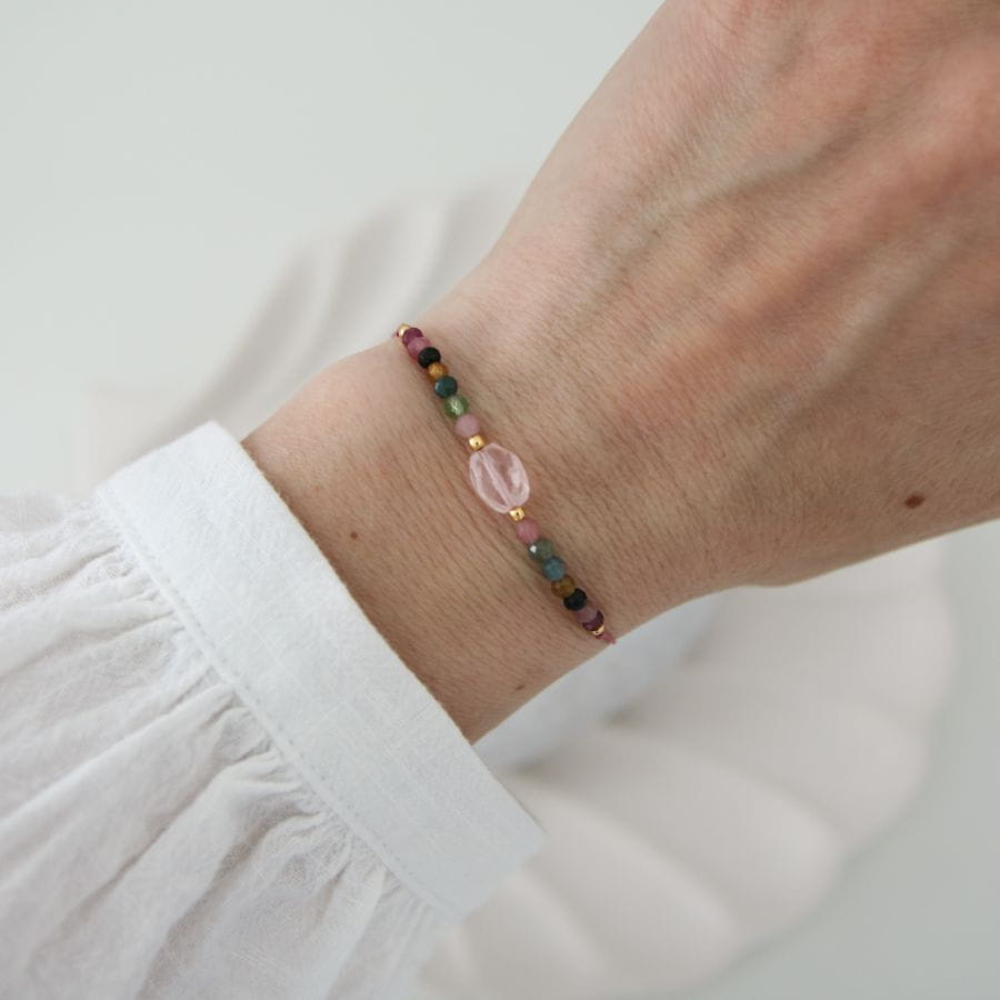 Bransoletka składa się z Kwarcu Różowego, Turmalinu Kolorowego oraz srebrnych, pozłacanych kuleczek. Kamienie nawleczone są na różową nić - całość pięknie prezentuje się na nadgarstku. Nie musisz martwić się rozmiarem, gdyż jest uniwersalny. Bransoletka zakończona jest stoperem, który zapewnia wygodną regulację rozmiaru oraz ułatwia zdjęcie i założenie bransoletki na rękę.