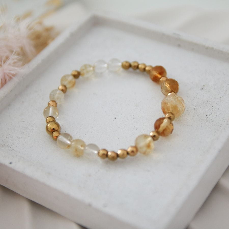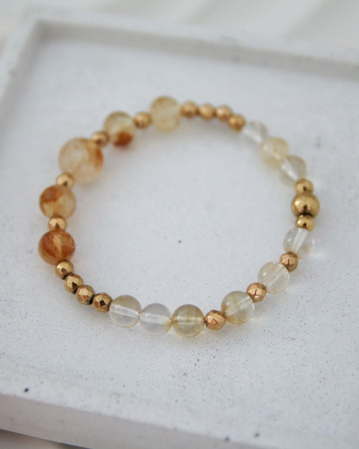 Bransoletka składa się z kamieni szlachetnego Cytrynu oraz złotego hematytu. Wielkość kamieni to 10mm,8mm,6mm. Koraliki nawleczone są na elastyczną żyłkę jubilerską, dostępne w dwóch rozmiarach do wyboru: