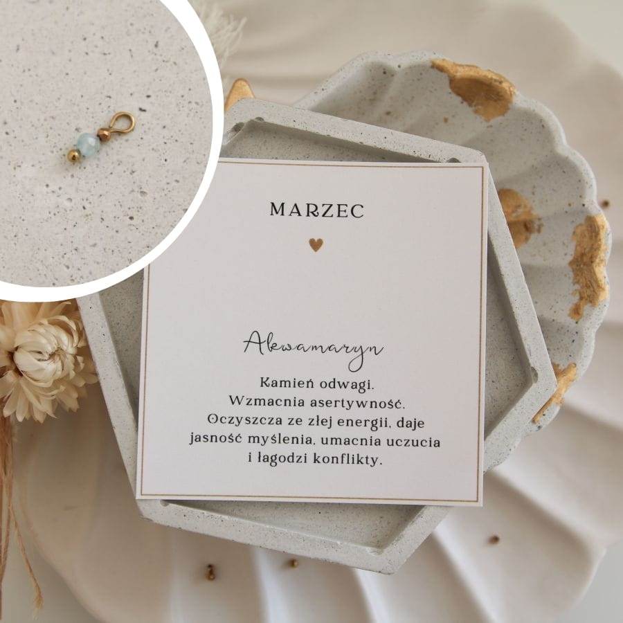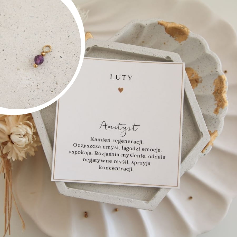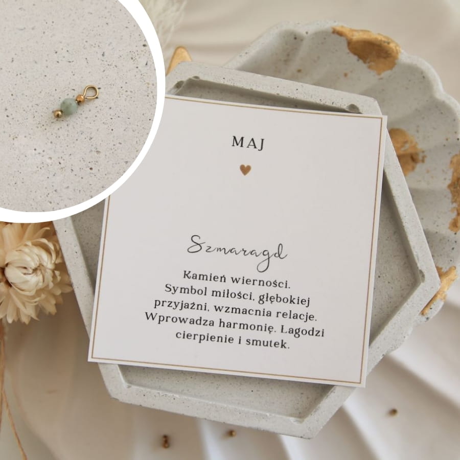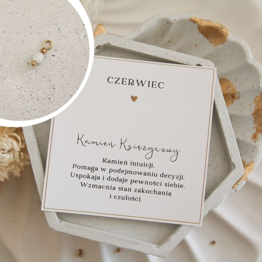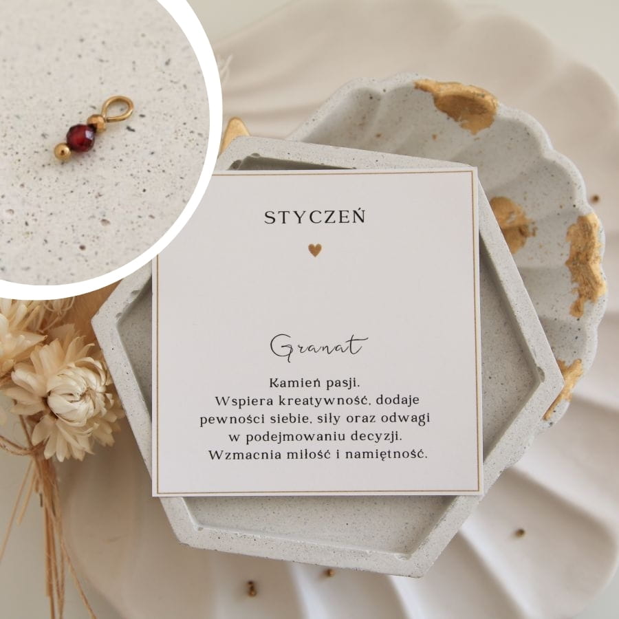 Biżuteria zapakowana jest w białe, eleganckie pudełeczko ze złotym zdobieniem. Wewnątrz dedykacja- możesz wpisać swój własny tekst lub wybrać gotową, widoczną na zdjęciu z nazwą miesiąca i opisem kamienia.