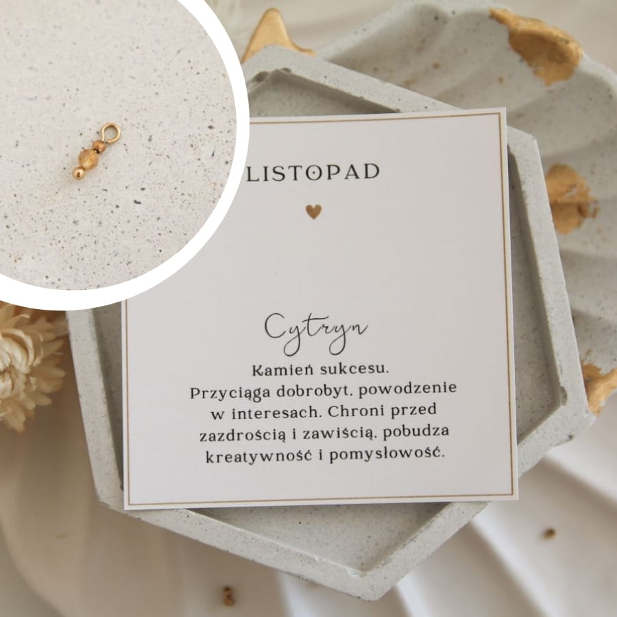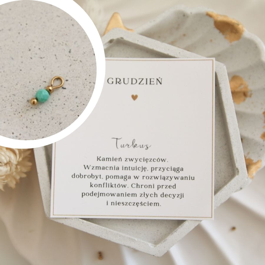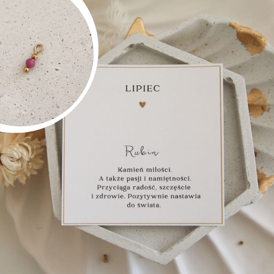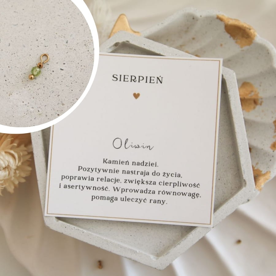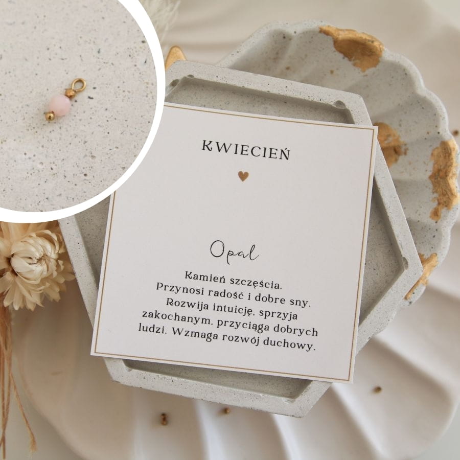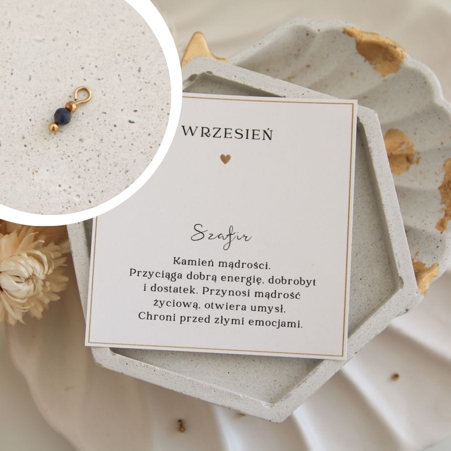 Biżuteria zapakowana jest w białe, eleganckie pudełeczko ze złotym zdobieniem. Wewnątrz dedykacja- możesz wpisać swój własny tekst lub wybrać gotową, widoczną na zdjęciu z nazwą miesiąca i opisem kamienia.