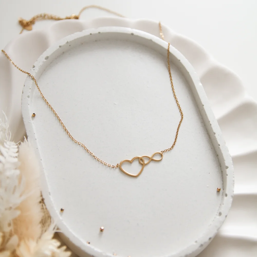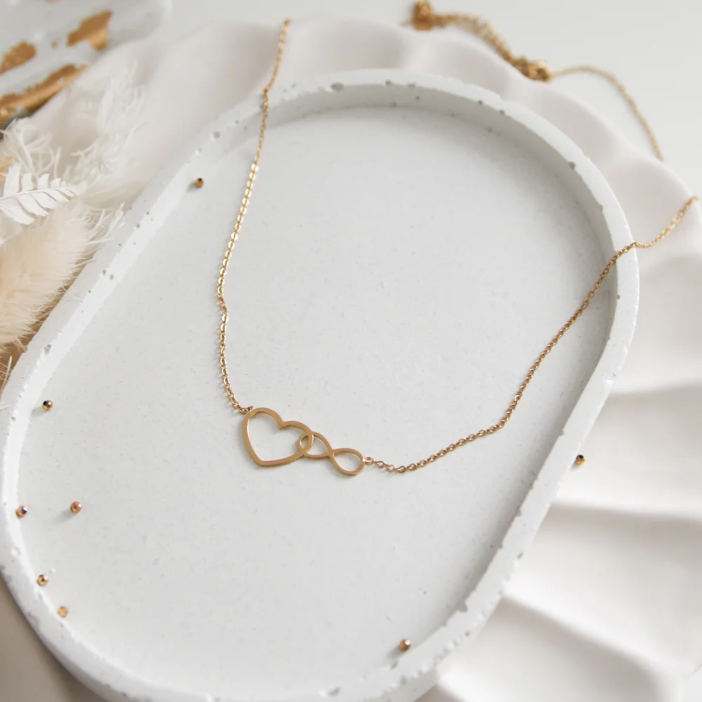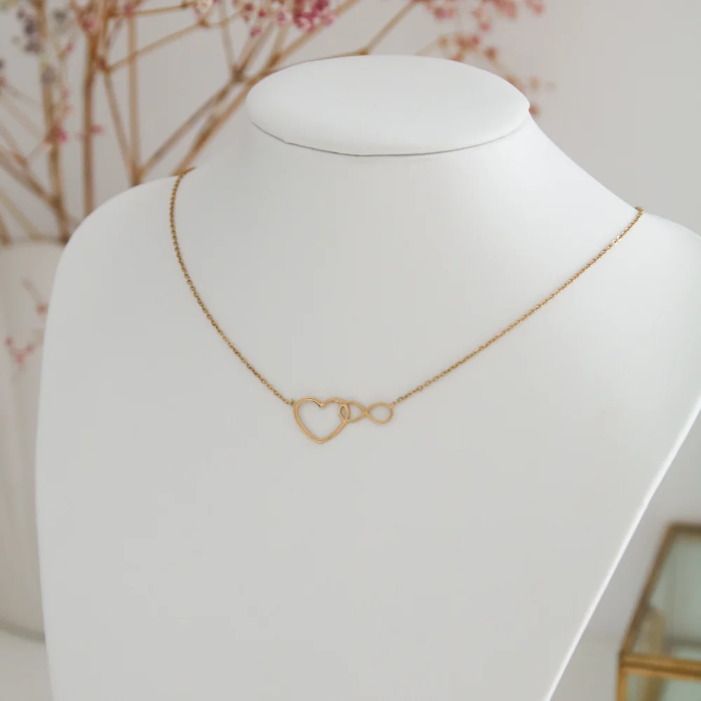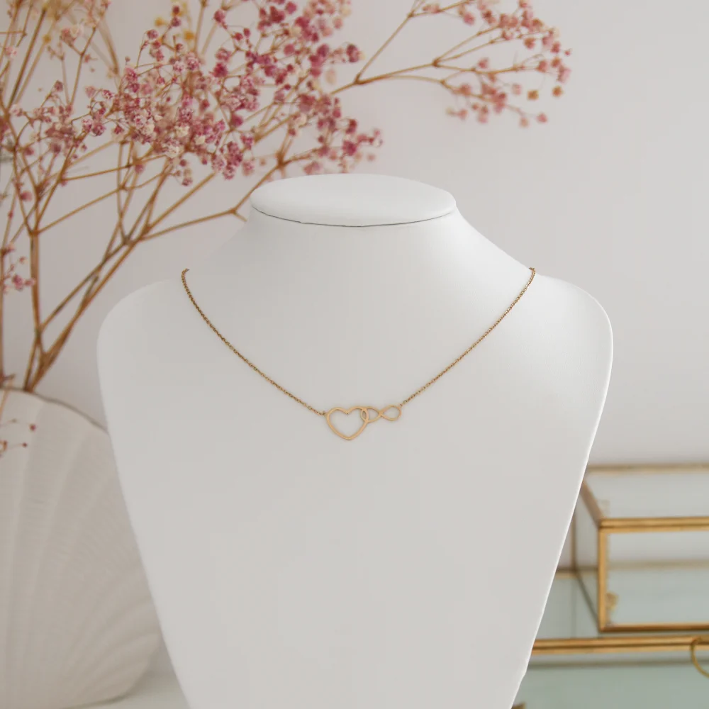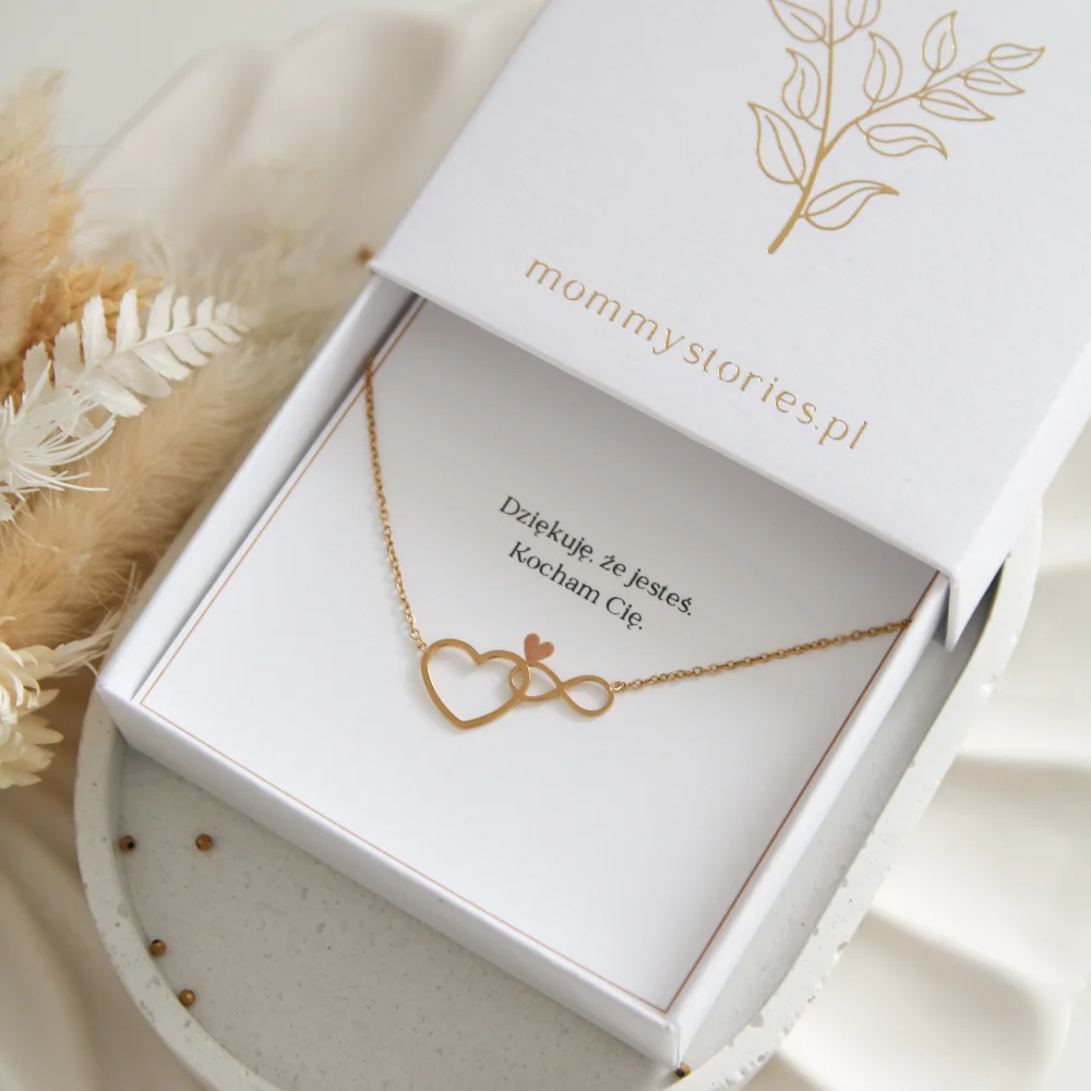 Naszyjnik z pozłacanej stali chirurgicznej z motywem serca i nieskończoności – symbolem trwałej więzi i miłości.