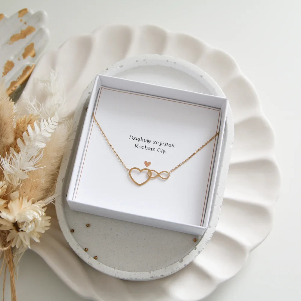 Subtelny naszyjnik z motywem serca przeplatanego z nieskończonością to ponadczasowy dodatek, który pięknie wyraża to, co nieprzemijające – miłość, przyjaźń i bliskość. Wykonany z pozłacanej stali szlachetnej, zachowuje swój blask przez długi czas i jest odporny na utratę koloru. Dodaj do niego dedykację, by nadać mu osobistego charakteru – wpisz własne słowa lub wybierz jedną z gotowych propozycji. To wyjątkowy prezent dla kogoś bliskiego lub symbol znaczącej relacji, który zawsze będzie przypominał o tym, co naprawdę ważne