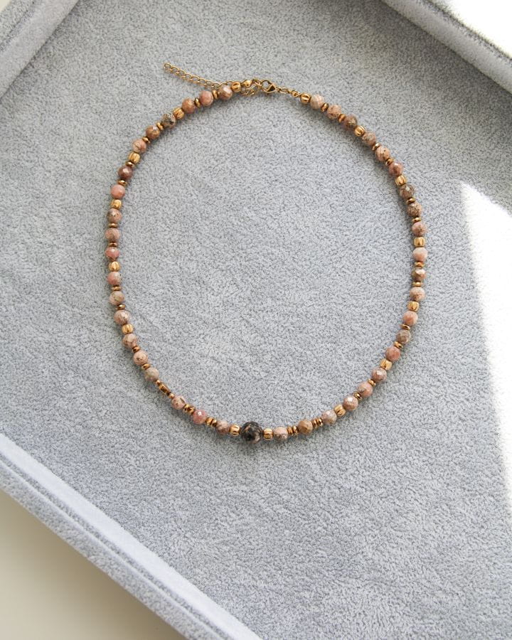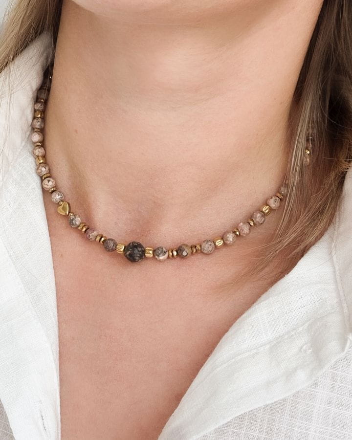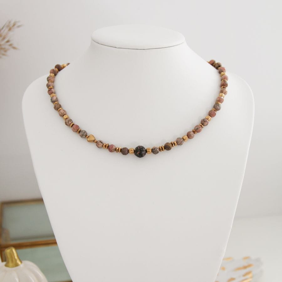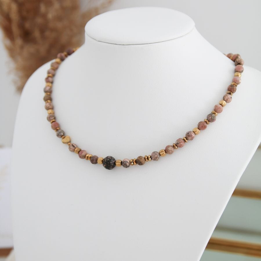 Naszyjnik typu choker, najlepiej wygląda noszony blisko szyi. Wykonany jest z kamieni rodonitu w pięknym pudorowo-różowym wybarwieniu, złotego hematytu (przekładki i serduszko) oraz dodatków ze stali szlachetnej (chirurgicznej), która ma właściwości antyalergiczne i nie uczula. Nie martw się, nasza stal jest wysokiej jakości, złocenie jest bardzo trwałe, nie wyciera się i nie ciemnieje.