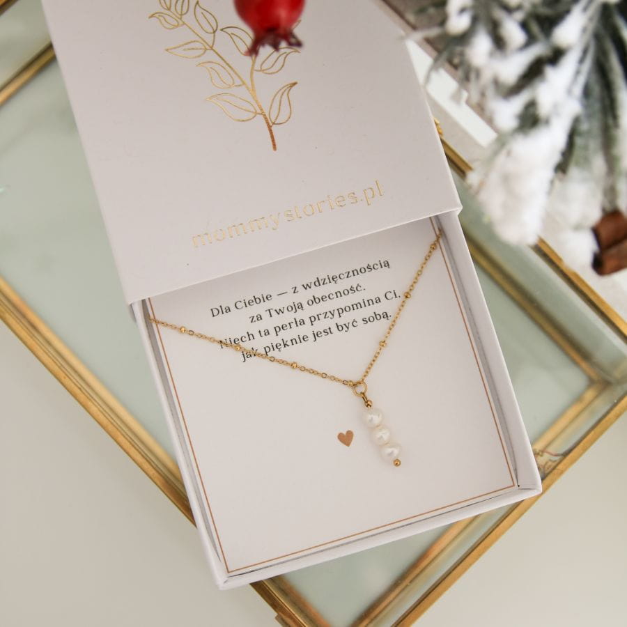 Naszyjnik zapakowany jest w białe, eleganckie pudełeczko ze złotym zdobieniem.