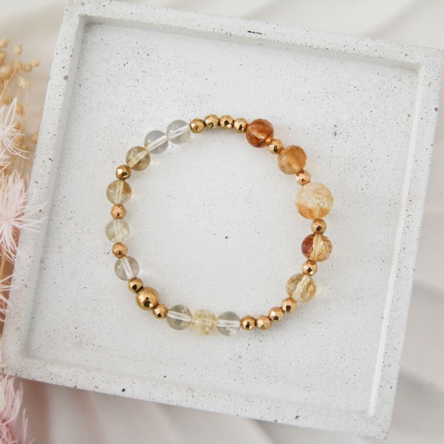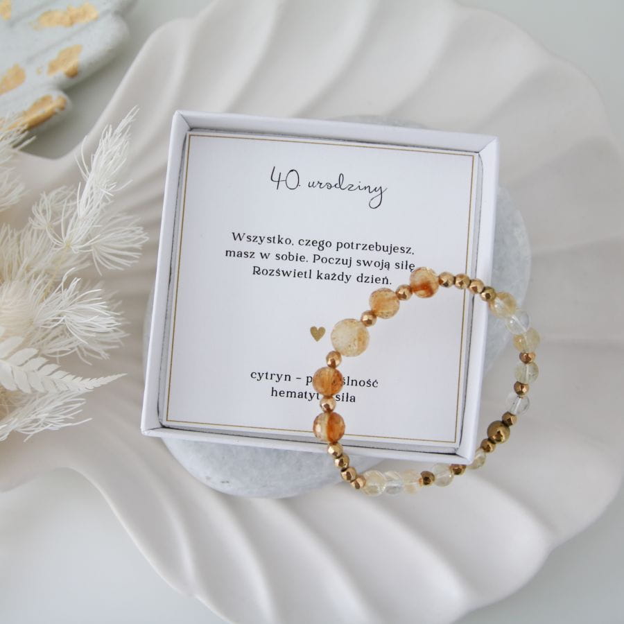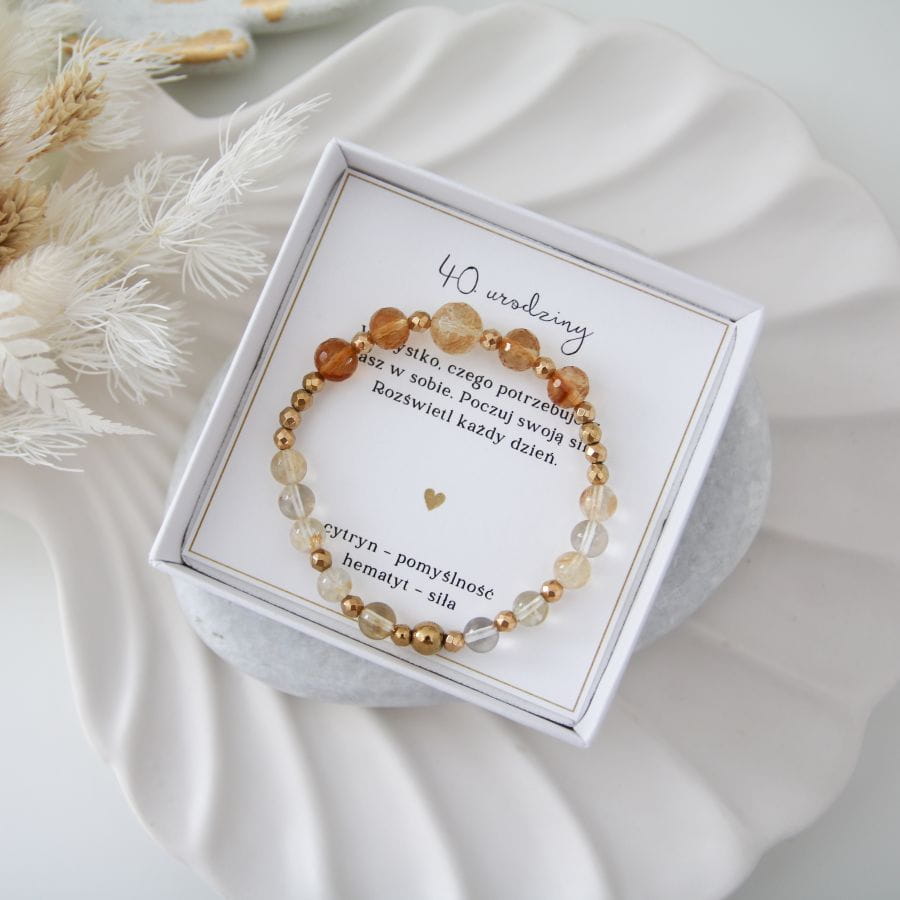 Ta bransoletka celebruje kobietę, która zna swoją wartość i nie boi się sięgać po więcej. Cytryn wnosi lekkość i optymizm, a hematyt pomaga działać z odwagą i spokojem. Idealna dla tych, którzy wiedzą, że 40-tka to początek nowej, pięknej ery.
