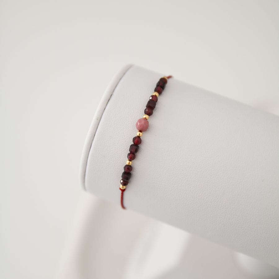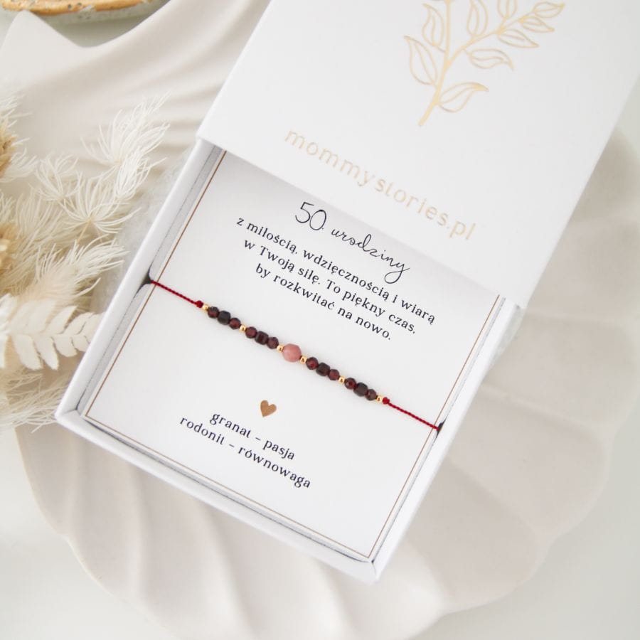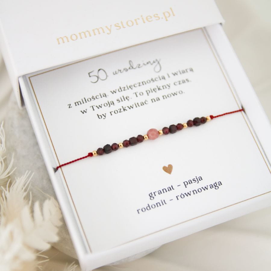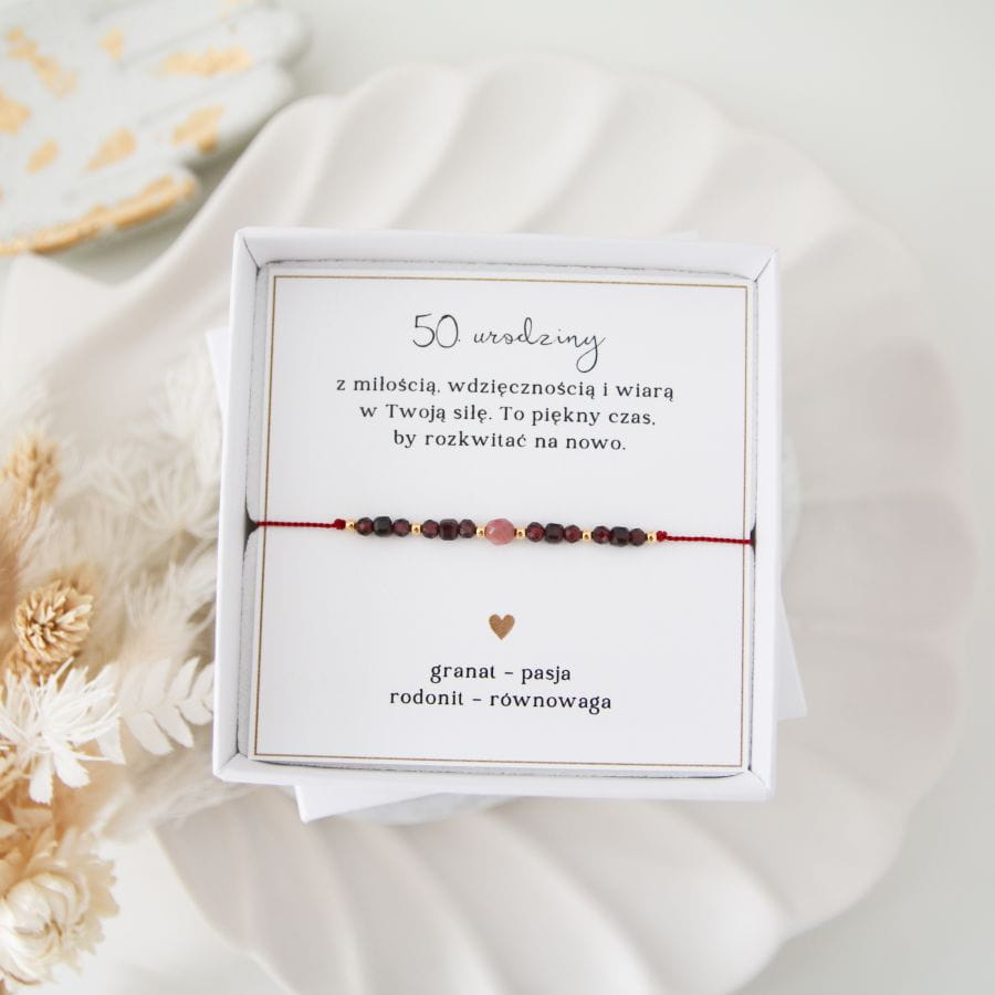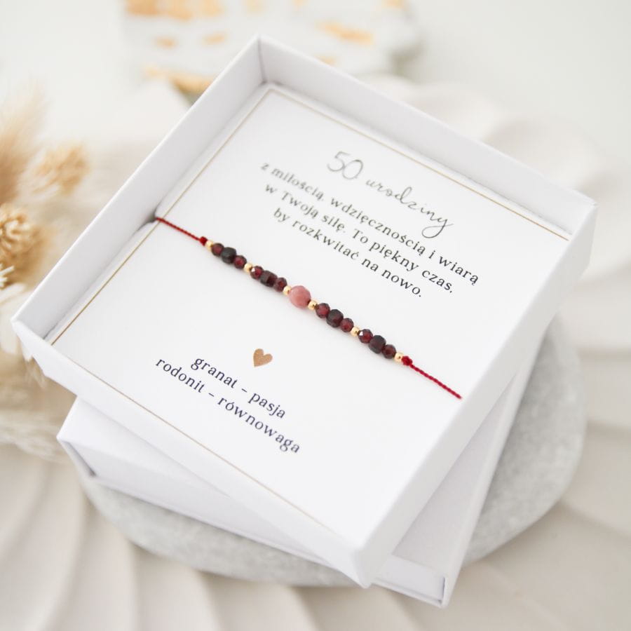 Cudowne połączenie kamieni granatu i rodonitu tworzą bransoletkę pełną mocy serca i odwagi do działania, idealną na prezent na 50. urodziny.
